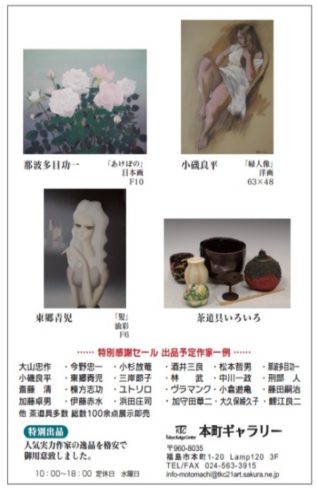 有名人気作家の日本画、洋画、版画、陶芸、茶道具などを、7~3割引きの特別価格にて展示即売いたします。